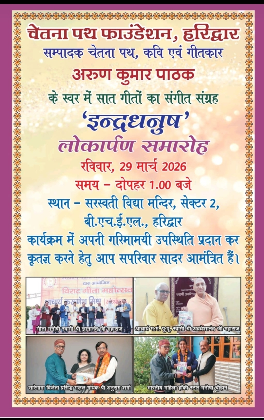 हरिद्वार। चेतना पथ फाउंडेशन की ओर से आज रविवार को भेल उपनगरी के सैक्टर-2 स्थित सरस्वती विद्या मदिर में आयोजित किये जा रहे कार्यक्रम में कवि, साहित्यकार तथा चेतना पथ के सम्पादक अरुण कुमार पाठक के सात गीतों के आडियो एल्बम ‘इन्द्रधनुष’ का लोकार्पण तथा मासिक पत्रिकाचेतना पथ के छठे वर्ष के प्रवेशांक (अप्रैल 2026) का विमोचन मुख्य अतिथि पूर्व केन्द्रीय शिक्षा मंत्री, उत्तराखण्ड के पूर्व मुख्यमंत्री तथा कवि एवं साहित्यकार डॉ० रमेश पोखरियाल निशंक द्वारा किया जायेगा। यह जानकारी देते हुए अरुण कुमार पाठक ने बताया कि यह कार्यक्रम विद्यालय के विशाल माधव भवन में आज रविवार 28 मार्च को अपराह्न 2.00 बजे से आयोजित किया जायेगा। कार्यक्रम में विशिष्ट अतिथि के रूप में, प्रसिद्ध ग़ज़ल गायक व सारेगामा टीवी शो के विजेता डा० अनुराग शर्मा, रानीपुर विधायक आदेश चौहान, भेल नई दिल्ली से सेवा निवृत्त कार्यपालक निदेशक, बलवीर तलवार तथा नगर के मुख्य विकास अधिकारी डा० ललित नारायण मिश्रा उपस्थित रहेंगे। इसी दौरान, आडियो एलबम ‘इन्द्रधनुष’ के गीतों को हरिद्वार के लोकप्रिय कलाकारों द्वारा उपस्थित जनसमूह के प्रस्तुत किया जायेगा। कार्यक्रम की अध्यक्षता डाॅ० बलवीर तलवार करेंगे।