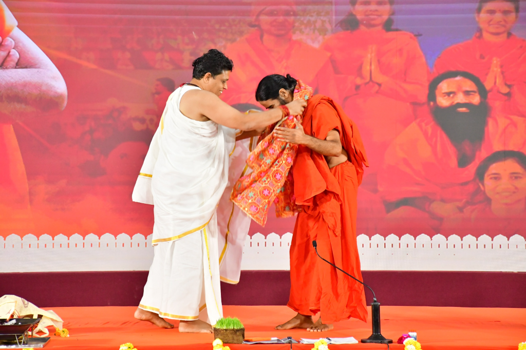उन्होंने कहा कि हमें गौरव होता है कि स्वामी जी महाराज जीवंत विग्रह के रूप में उन मर्यादाओं की पुनर्स्थापना के लिए अहर्निश प्रयासरत हैं। उनका जीवन और जीवन में उनका संघर्ष दोनों ही अनुकरणीय है। उन्होंने कहा कि हम सब सौभाग्यशाली हैं कि श्रद्धेय स्वामी जी के साथ हमें सहयोगी की तरह कुछ करने का भगवान ने हमें निमित्त बनाया। आज पतंजलि परिवार के लिए बहुत महत्वपूर्ण दिन है कि संन्यास परंपरा की गौरवशाली विधा को स्वामी जी ने स्वयं अंगीकार करके एक अनुकरणीय उदाहरण प्रस्तुत किया है और उसी परंपरा में आज कई सौ पूज्य संन्यासी भाई, पूज्या साध्वी बहनें उस परंपरा और उस मर्यादा का अनुकरण और अनुसरण करते हुए इस सनातनी संस्कृति की पुनर्स्थापना के लिए प्रयासरत हैं।