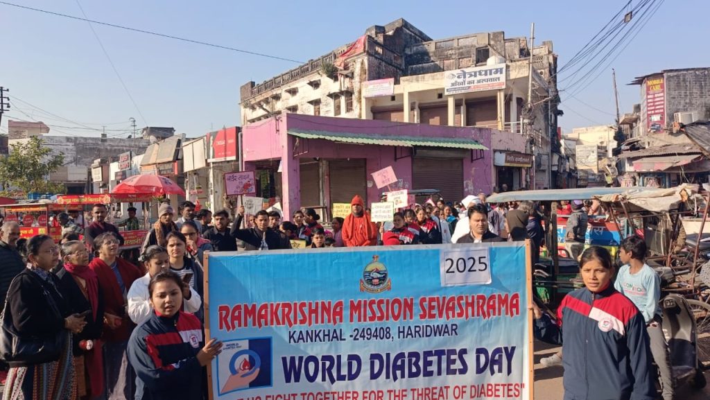 रामकृष्ण मिशन सेवा आश्रम के डायबिटीज सपोर्ट ग्रुप के बच्चों, अभिभावकों, नर्सिंग स्टाफ, छात्र-छात्राएं और साधु संतों ने भव्य रूप में विश्व मधुमेह दिवस और बाल दिवस मनाया। मधुमेह से बचने के लिए रोकथाम कैसे की जाए इस विषय पर एक विशाल जागरूकता रैली निकाली गई, जो रामकृष्ण मिशन सेवाश्रम के मुख्य द्वार से प्रारंभ हुई और कनखल के रविदास बस्ती, बाल्मीकि बस्ती, कनखल थाना, वैश्य कुमार सभा मार्ग चोपटा मोहल्ला मार्ग, सर्राफा बाजार, चौक बाजार, पहाड़ी बाजार रामकृष्ण मिशन चौक चौक होते हुए सेवाश्रम में समाप्त हुई। रैली में 4 साल के बच्चे से लेकर युवा, मुंबई से आए कुछ डॉक्टर और संत शामिल हुए। कनखल चौक बाजार में श्री मिथिलेश सनातन धर्म इंटर कॉलेज कनखल की प्रबंध समिति के अध्यक्ष एवं श्री सनातन धर्म प्रतिनिधि सभा पंजाब नई दिल्ली के राष्ट्रीय उपाध्यक्ष समाजसेवी सुधीर कुमार गुप्ता की ओर से रैली में प्रतिभाग करने वाले सभी प्रतिभागियों को फल वितरित किए गए।